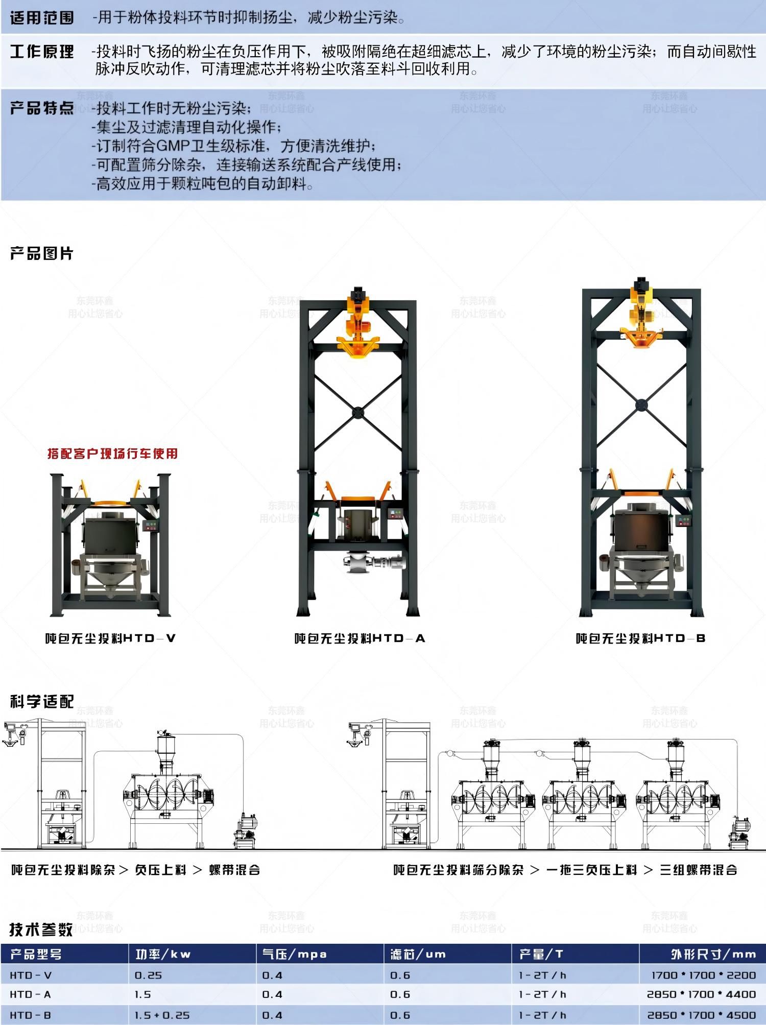 适用于粉体投料时抑制扬尘,减少粉尘污染及吨包自动卸料。